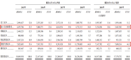 成本方面,公司的服务成本一直保持历年总收入的60%左右。而细分来看,货运代理成本通常占服务成本的40%以上,而港口及仓库费用、车辆成本和员工成本合约占服务成本的另外40%。