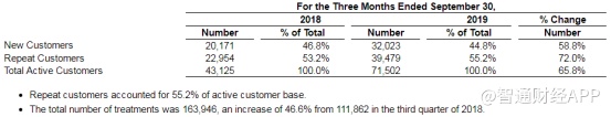 财报显示,在今年第三季度,医美国际获得新用户人数达32023人,同比增长58.8%;回头客用户达39479人,同比增长55.2%。二者相加,公司在今年第三季度总客户数达到71502人,同比增长65.8%。