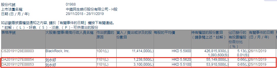智通财经APP获悉,港交所最新资料显示,11月25日和26日,非执行董事刘永好分别增持民生银行(01988)310万股及123.85万股,合计433.85万股,每股作价分别为5.51港元、5.562港元,总金额约为2396.95万港元。增持后最新持股数目为5514.90万股,最新持股比例为0.66%。