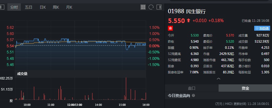 截至今日收盘,民生银行(01988)涨0.18%,报5.55港元。