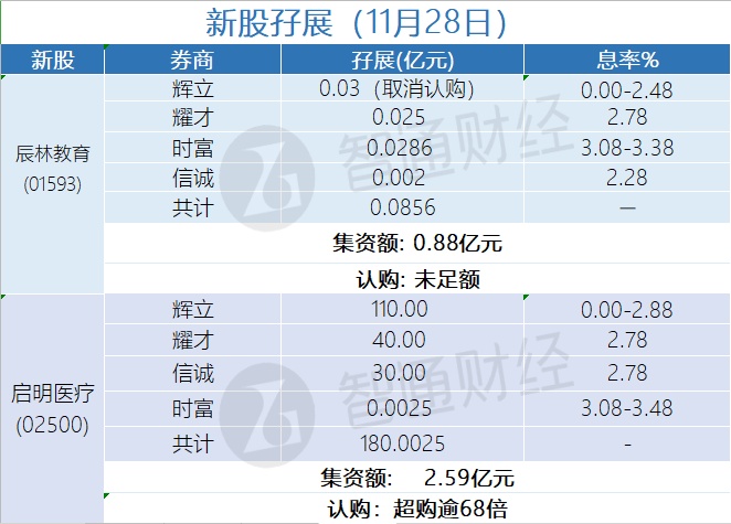 智通财经APP获悉,11月28日,辰林教育(01593) 、启明医疗(02500) 、索信达(03680) 、招商局房托(01503)正在招股中。其中,启明医疗超购逾68倍,其它三家均未足额。