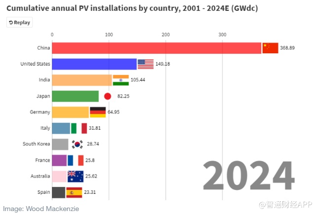 智通财经APP获悉,全球知名能源咨询顾问公司伍德麦肯兹估计,到2024年,中国太阳能光伏装机容量累计将达到370吉瓦,是美国的两倍多。