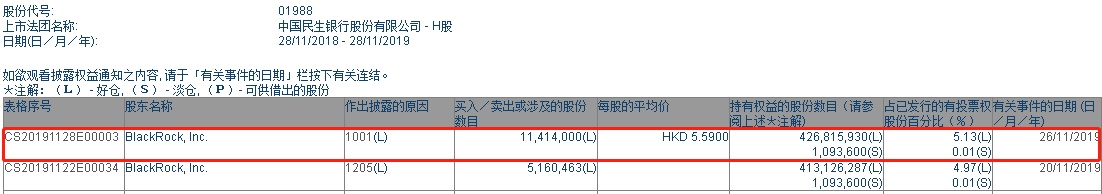 智通财经APP获悉,港交所最新资料显示,11月26日,贝莱德增持民生银行(01988)1141.4万股,每股作价5.59港元,总金额约为6380.43万港元。增持后最新持股数目约为4.27亿股,最新持股比例为5.13%。