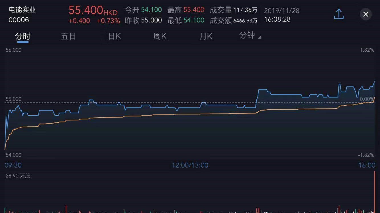 截至今日收盘,电能实业(00006)涨0.73%,报55.4港元。