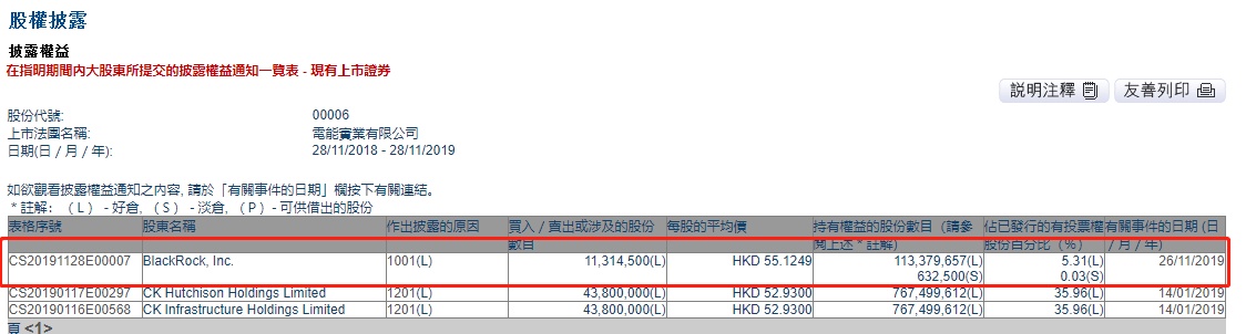 智通财经APP获悉,联交所最新资料显示,11月26日,贝莱德增持电能实业(00006)1131万股,每股作价55.1249港元,涉及总金额约为6.23亿港元。增持后最新持股数目约为1.13亿股,最新持股比例为5.31%。