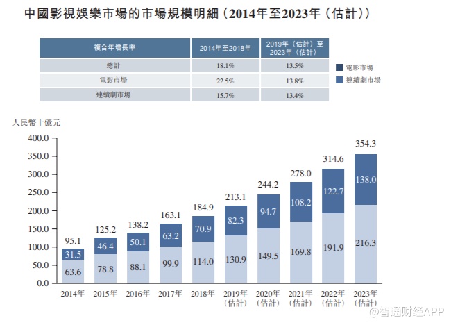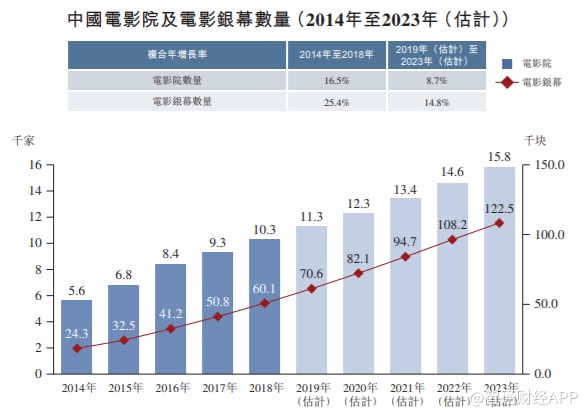 电影院数量于2014年至2018年亦经历快速增长,由2014年约5600间增至 2018年约10300间。复合年增长率为16.5%。期间电影银幕数量亦快速增加, 由约24300块增加至约60100块,复合年增长率为25.4%。预计电影院及电影银幕数量于2023年将分别达至15800家及122500块。