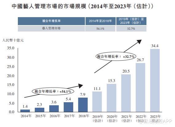 艺人管理市场的市场规模于2014 年至2018年录得快速增长,从约14亿元增至约79亿元,复合年增长率为 54.1%。随着艺人管理公司开始逐渐采用流水线明星培训模式,具有专业知识、经验丰富及大量粉丝群的高素质艺人将成为公司的核心资源。因此,到2023年,市场规模预计将达到约人民币344亿元。