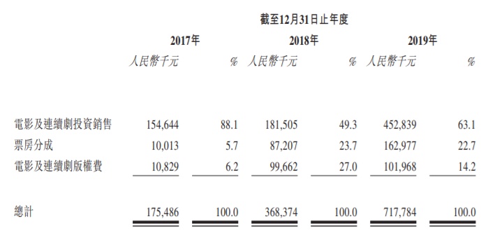该公司主要收入来自电影及连续剧投资及制作管理,主要包括 (1)出售电影投资所得收益;(2)票房收入分成所得收益;及(3)电影及连续剧版权费收益。其中,电影及连续剧投资销售收益占比由2017年的88.1%降到2019年的63.1%;票房分成比例快速增加。