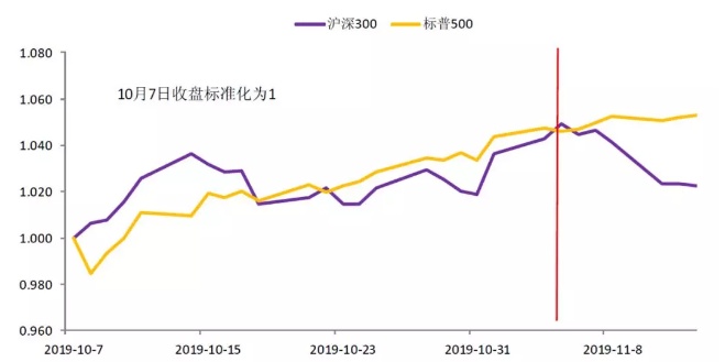 首先是传说中的“十月魔咒”并没有奏效,相反,标普500指数持续拉升并再刷历史新高。进入十一月,贸易局势接二连三的好消息提振了股票等风险资产,此外,第三季度财报中,高达75%的公司每股收益超过了市场预期,且高于五年平均水平。