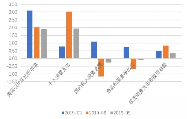 具体来看,2019年美国经济增速总体较2018年放缓,但仍有超预期的增长,前三季度GDP环比折年率拾级而下,分别为3.1%、2%和1.9%。分项来看,目前消费和就业较强,工业生产和投资较弱。消费是今年美国经济的主要支撑点,消费具有韧性的根本原因在于美国就业市场的强劲,就业反映了去年及今年前两季度经济增长的强劲。