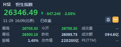截至收盘,恒生指数跌547.24点或2.03%,报26346.49点,全日成交额达894.64亿。国企指数跌2.46%,报10301.82点,红筹指数跌2.21%,报4162.16点。