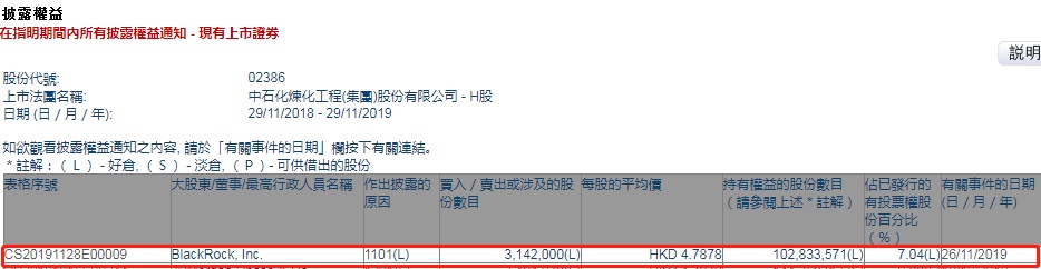 智通财经APP获悉,港交所最新资料显示,11月26日,贝莱德增持中石化炼化工程(02386)314.2万股,每股作价4.7878港元,总金额约为1504.33万港元。增持后最新持股数目约为1.03亿股,最新持股比例为7.04%。