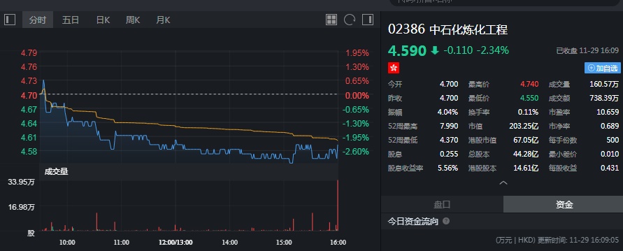 截至今日收盘,中石化炼化工程(02386)跌2.34%,报4.59港元。