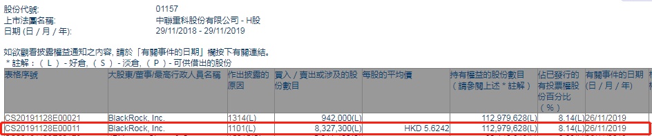 智通财经APP获悉,港交所最新资料显示,11月26日,贝莱德增持中联重科(01157)832.73万股,每股作价5.6242港元,总金额约为4683.44万港元。增持后最新持股数目约为1.13亿股,最新持股比例为8.14%。