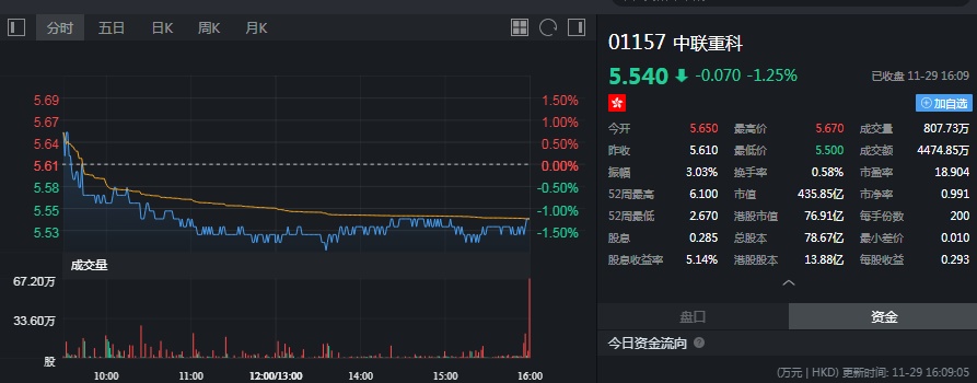 截至今日收盘,中联重科(01157)跌1.25%,报5.54港元。