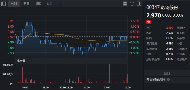 截至今日收盘,鞍钢股份无涨跌,报2.97港元。