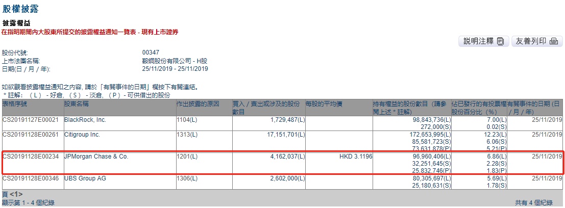 智通财经APP获悉,联交所最新资料显示,11月25日,摩根大通减持鞍钢股份(00347) 416.2万股,每股作价3.1196港元,总金额约为1298.39万港元。减持后最新持股数目约为9696万股,最新持股比例为6.86%。