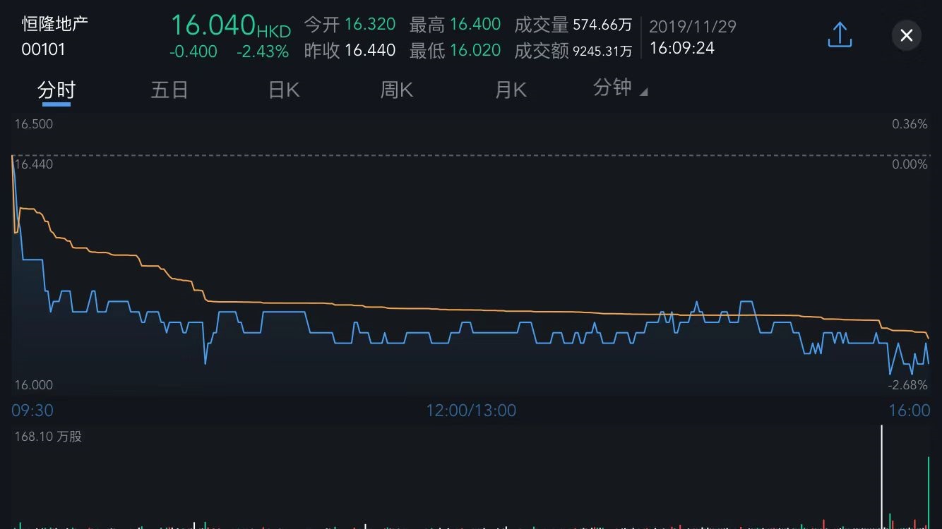 截至今日收盘,恒隆地产(00101)跌2.43%,报16.04港元。