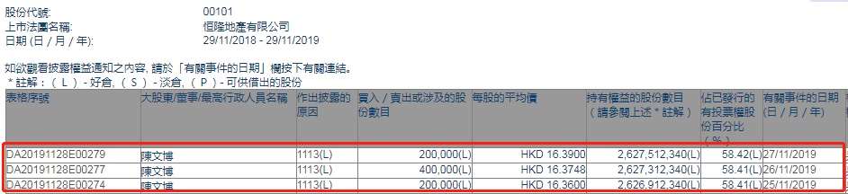 智通财经APP获悉,联交所最新资料显示,11月25日至11月27日,执行董事陈文博三次增持恒隆地产(00101)80万股,每股作价分别为19.36港元、16.3748港元及16.39港元,涉及总金额约为1310万港元。增持后最新持股数目约为26.28亿股,最新持股比例为58.42%。