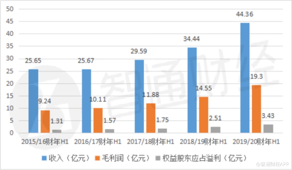 据智通财经APP统计,自2015/16财年以来,波司登中期营业收入从25.65亿元增长至2019/20财年的44.36亿元,期间复合增长率达到14.68%;期间毛利润由9.24亿元增长至19.3亿元,复合增长率达到20.22%;期间权益持有人应占溢利由1.31亿元增长至3.43亿元,复合增长率高达27.2%。