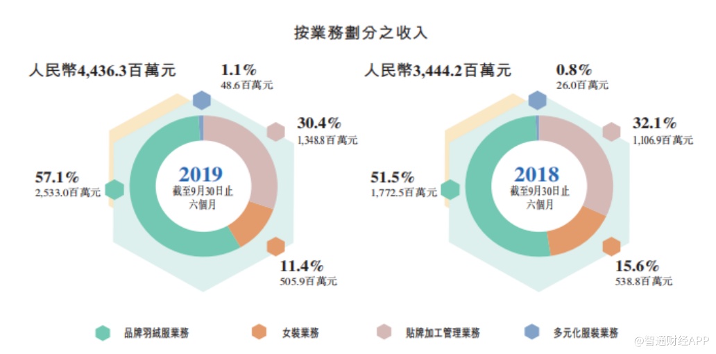 其中,品牌羽绒服业务期内实现收入约25.33亿元,占总收入的57.1%,同比增长42.9%;贴牌加工管理业务实现收入约13.49亿元,占总收入的 30.4%,同比增长21.9%;女装业务实现收入约5.06亿元,占总收入的11.4%;多元化服装业务实现收入约0.49亿元,占总收入的1.1%,同比增长86.9%。