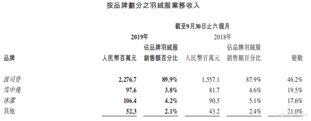 这四大业务板块中,品牌羽绒服作为波司登改革的“主角”,上半年的发展取得了全新突破。其中波司登主品牌于期内的收入达到22.77亿元,同比增长46.2%;雪中飞品牌收入达到0.98亿元,同比增长19.5%,冰洁品牌收入突破亿元大关,达到1.06亿元,同比增长17.6%。