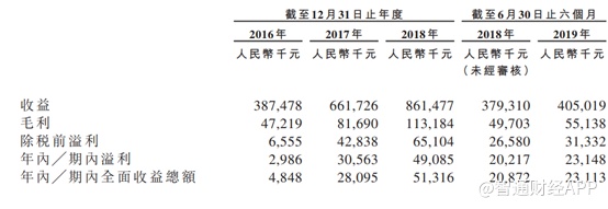 2016至2018年,公司收入分别为3.87亿元、6.62亿元、8.61亿元,同比分别增长71%及30%,2019年上半年收入4.05亿元,同比增长6.9%。期内毛利分别为4721.9万元、8169万元、1.13亿元及5513.8万元;年内/期内溢利分别为298.6万元、3056.3万元、4908.5万元及2314.8万元。
