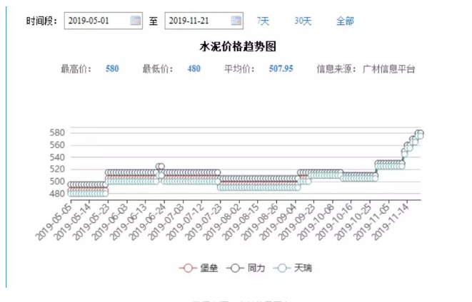 11月22日,记者在广财信息网上查询的数据显示,山东水泥价格前期缓步上涨,进入11月份后价格涨势趋于明显,最高价格为555元/吨,11月中下旬以来价格仍在高位徘徊。