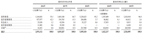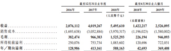 于2016年、2017年、2018年以及2018年及2019年上半年,公司分别录得收益人民币20.8亿元、人民币40.2亿元、人民币55.0亿元、人民币14.2亿元及人民币25.3亿元。其中2016年-2018年的收益复合年增长率约为62.7%; 2018年上半年-2019年上半年,收益增幅约为77.6%。