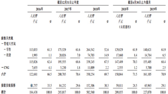 公司的收入主要来自于(i)根据特许经营权在公司的经营地区通过公司的市政管网向零售客户(包括居民客户及非居民客户(包括工业、商业及公共服务客户))销售管道天然气;及(ii)提供接驳安装服务,例如建设庭院入户管网,将其接驳至公司的市政管网及安装管道及燃气表。