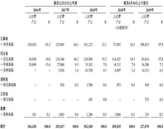 于六个经营地区,如皋地区及武邑地区产生的收入占公司收入的大部份,合共分别约占公司截至2018年12月31日止三个年度及截至2019年6月30日止六个月总收入的84.3%、88.4%、83.6%及85.7%。
