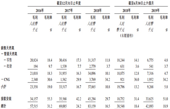 公司截至2018年12月31日止三个年度的毛利率下降主要归因于(i)平均管道天然气采购价增加导致天然气销售的毛利率下降;及(ii)公司接驳安装服务的毛利率下降,此主要归因于公司为天然气村村通工程提供接驳安装服务的收入贡献比例增加,其截至2018年12月31日止三个年度的毛利率相对较低,分别约为12.6%、12.9%及13.7%。截至2018年及2019年6月30日止六个月的毛利率保持稳定,主要归因于以下各项的综合影响:(i)接驳安装服务的毛利率由截至2018年6月30日止六个月的约31.4%增加至截至2019年6月30日止六个月的约51.0%,主要由于武邑天然气村村通工程1号及深州天然气村村通工程因其大部份工程已于先前年度竣工而接近尾声,其已竣工工程的金额因此而下降,导致公司为该等工程提供接驳安装服务所产生的收入贡献比例减少;及(ii)公司天然气销售的毛利率由截至2018年6月30日止六个月的约13.2%下降至截至2019年6月30日止六个月的约5.8%,主要归因于以下各项的综合影响:(a)公司供应商收取的平均管道天然气采购价的上涨;及(b)由于其数量增加,公司向居民客户销售天然气的收入贡献比例随之增加。