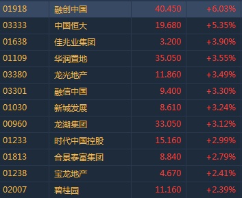 智通财经APP获悉,百强房企11月拿地保持积极,内房股盘中全线大涨,融创中国(01918)涨超6%,暂领涨板块。截至11时13分,融创中国(01918)涨6.03%,中国恒大(03333)涨5.35%,佳兆业集团(01638)、华润置地(01109)、龙光地产(03380)及融信中国(03301)均涨超3%。碧桂园(02007)涨2.39%。