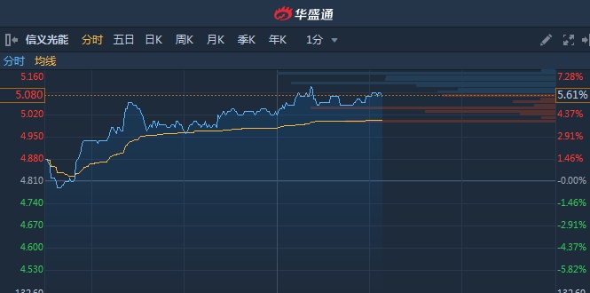 年政策框架已基本确定,信义光能(00968)获资金追捧,股价大幅上扬,截至14时07分,涨5.61%,报价5.08港元,成交额1.238亿。