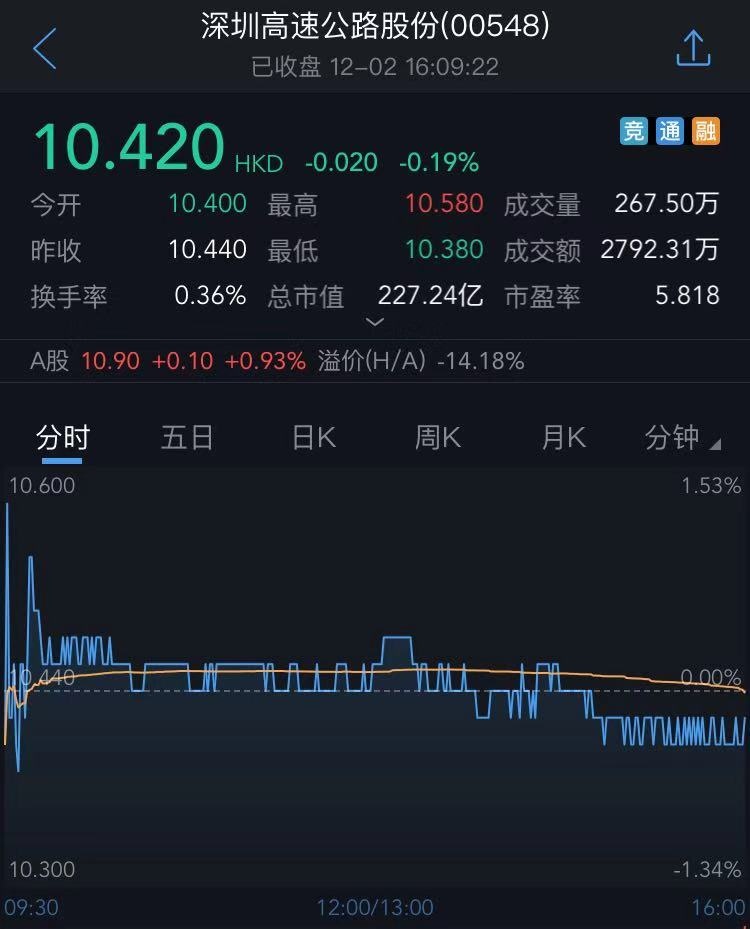 截至今日收盘,深高速跌0.19%,报10.42港元。