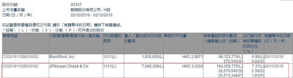 智通财经APP获悉,港交所最新资料显示,11月26日,摩根大通增持鞍钢股份(00347)709.94万股,每股作价3.026港元,总金额约为2148万港元。增持后最新持股数目约为10405.98万股,最新持股比例为7.37%。