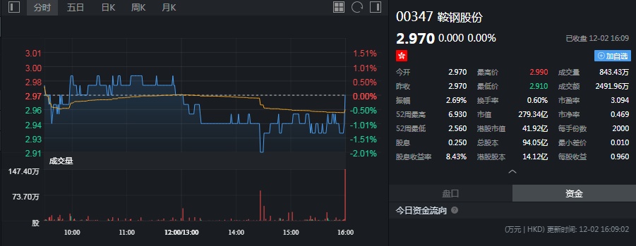 截止今日收盘,鞍钢股份无涨跌,报2.97港元。