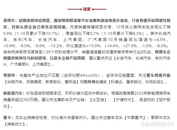 叠加取消限购等汽车消费刺激政策逐步落地,行业有望开启周期性复苏。目前头部企业已率先实现回暖,其中长城汽车和吉利汽车10月销量同比增长4.5%和0.9%,环比增长15.0%和14.4%,长安汽车同比下降8.0%,环比增长27.9%,上汽集团、广汽集团则分别同比下降9.6%、13.2%,环比分别减少1.0%和8.5%。