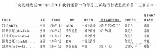 下列图表中列举了心动公司的部分主要热门付费游戏(截止2019年9月30日):