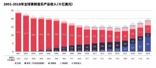国际唱片联合会 IFPI 发布的《2019 全球音乐报告》显示,全球音乐收入在本世纪前 14 年持续下跌,直到 2014 年跌入黑暗谷底。随后企稳反弹,连续多年实现正增长。