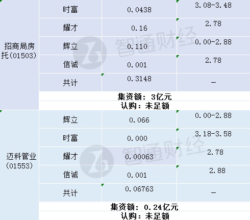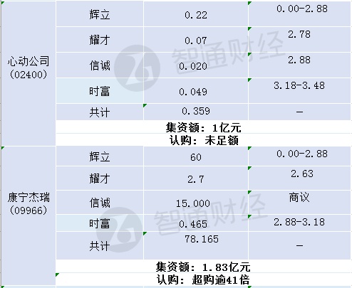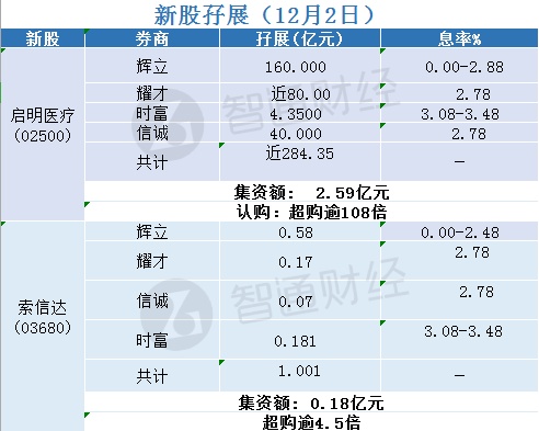 智通财经APP获悉,12月2日,启明医疗(02500) 、索信达(03680) 、招商局房托(01503)、迈科管业(01553)、心动公司(02400)、康宁杰瑞(09966)、 丰城控股(08216)正在招股中。其中,启明医疗超购逾108倍,索信达超购4.5倍,康宁杰瑞超购41倍,其它四家均未足额。