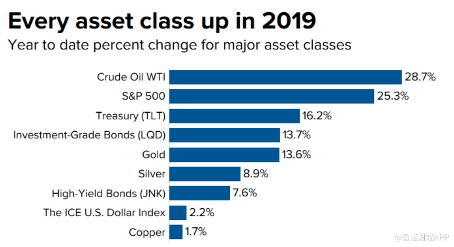 智通财经APP获悉,对于投资者来说,今年是美国市场各个资产表现最好的一年,无论是美国股市、债市、公司债务或者是大宗商品,投资者在这些资产类别内均获得收益,投资原油以及黄金的收益达到两位数。
