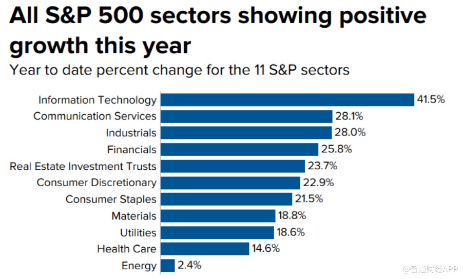 标普500指数内的11个行业板块都在年末获得了正回报。科技股是今年的最大的赢家,增长了41.5%。通信服务、工业、金融、房地产以及消费领域今年均飙升20%以上。