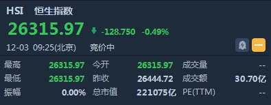 智通财经APP获悉,恒生指数开盘低开128.75点或0.49%,报26315.97点。国企指数跌0.35%,报10328.09点。红筹指数跌0.24%,报4197.3点。大市盘前成交30.71亿港元。