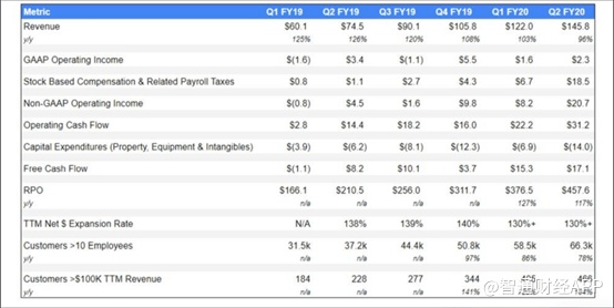 Zoom Video 9月份公布了2020财年第二季度业绩,该公司在大多数指标上均远超预期。营收较预期高出1500万美元,达1.458亿美元,同比增长96%。此外,过去十二个月给营收贡献超过10万美元的客户数量,环比增长15%,达到466家,同比增长104%。最后,该公司的净留存率仍保持在130%的异常高水平,仅略低于2019财年第四季度的140%。总体而言,Zoom Video的季度表现是惊人的,客户中迎来汇丰(HSBC.US)更是锦上添花。
