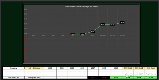 从下图的年度每股收益(EPS)趋势来看,Zoom Video是少见的头五年就获利的上市公司之一。大多数科技新股从公司创立到实现每股盈利至少需要五年的时间,而Zoom Video已在公司成立第三年,即2019财年就实现了这一目标。2019财年的每股收益为0.04美元,而2020财年的每股收益目前估计为0.19美元。这意味着同比增长了375%,这在当前软件领域的公司中处于行业领先者。