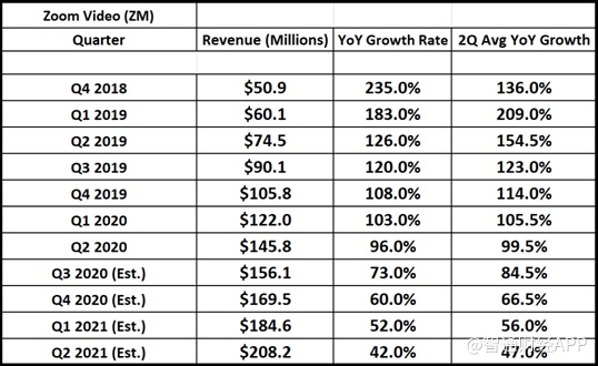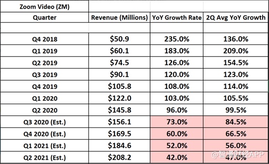 但是,如果从营收增速来看,Zoom2020财年后半年可能会大幅放缓。虽然2020财年第二季度营收同比增长96%,但预计下个季度将下滑2300个基点。这是因为当前对2020财年第三季度的营收估计为1.561亿美元,与2019财年第三季度的9010万美元相比,仅同比增长73%。更糟糕的是,这种减速预计延续到2020财年第四季度,在连续下滑的基础上再下降1300个基点。尽管估算不是绝对的,但该公司将需要在2020财年第三季度和第四季度的营收都大幅超出预期,才能避免出现减速。有分析预计该公司营收增速实质下滑500个基点或更多,Zoom Video的营收将需要达到1.721亿美元,才能防止这种情况的出现。尽管Zoom三季度营收有可能较预期高出1600万美元,因为上个季度就超出预期1500万美元,但这肯定不容易。