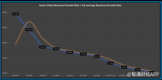 下表中的蓝线代表营收季度增长率,白线代表两季度营收增长率平均值,后者有助于缓和季节波动性,更好地体现整体趋势。从下图可以看出,Zoom Video的营收增长率明显呈下降趋势。虽然这在意料之中,因为没有哪个公司可以永远保持三位数的增长率,但是这些增长率下降的速度令人担忧。预计未来四个季度的销售同比增长分别为73%,60%,52%和42%,与Zoom先前的增长相比,这是相当温和的增长率。