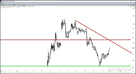如下面日线图所示,Zoom Video在61美元处有强大的支撑,但是正在81美元至83.00美元之间遇到阻力区域。这种反弹并没有从技术面改善该股,因为这25%的反弹发生在下跌趋势(高点较低)内。因此,没任何理由对此反弹感到过分兴奋。Zoom Video月度收盘价需要突破阻力位83美元,才能迎来变盘信号。