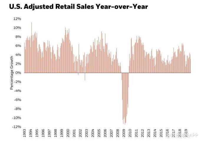 分析师称,在没有贸易或其他外部冲击的情况下,稳定的消费可令美国经济有望在2020年再次增长。自2009年底以来,实际个人消费每个季度都在增长。尽管家庭消费相对于历史而言表现仍较为温和,但也并没有像2007年末那样出现减速。